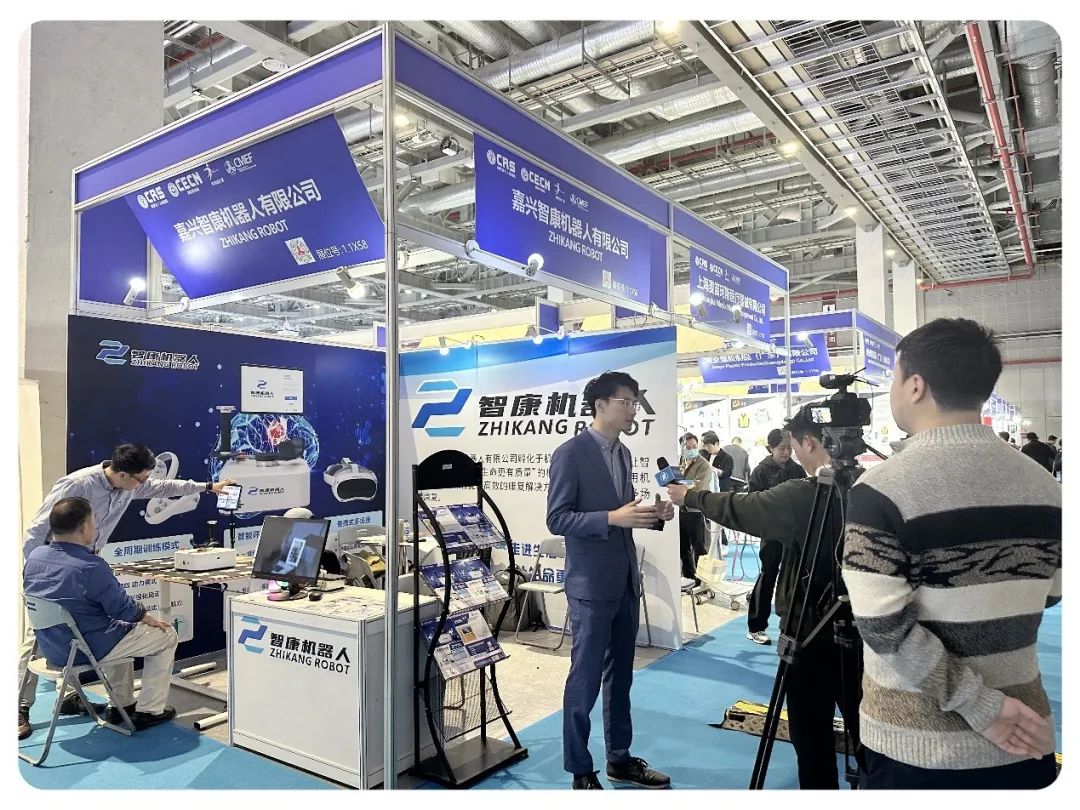 展台展示了智康自主研发的上肢康复机器人,充满趣味性的康复训练模式吸引了众多观众前来体验,也深受业内人士的好评。
