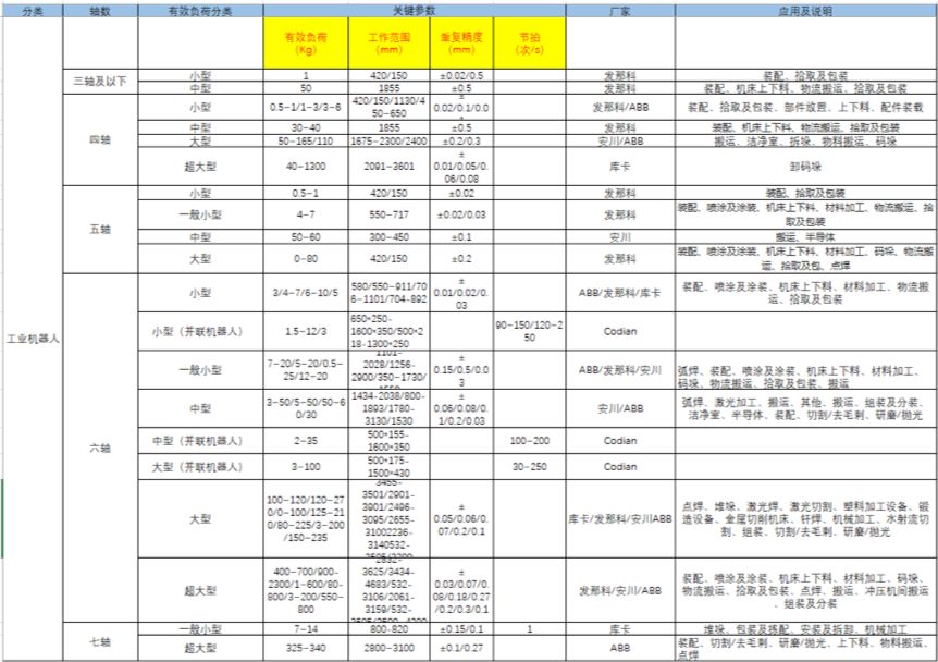 国外工业机器人相关参数